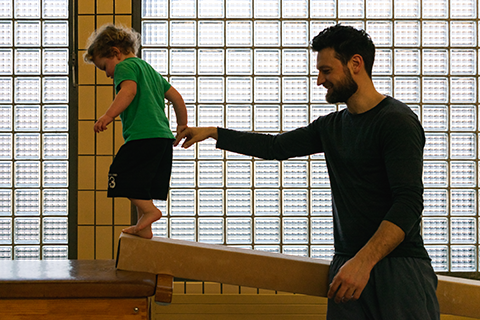 allgemein ans Kinderturnen in einem großen Geräteparcours herangeführt werden.