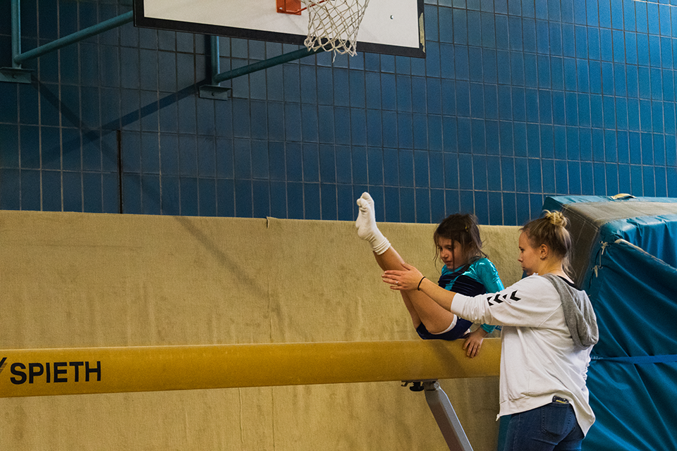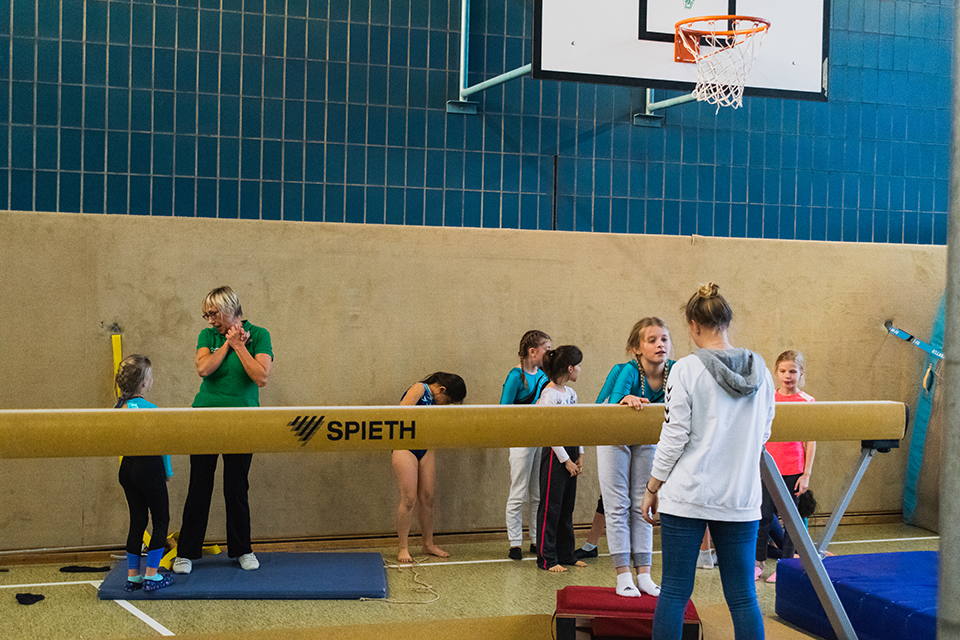 Übungsleiterinnen sind darauf bedacht den Kindern erstmal die Grundelemente des Turnens